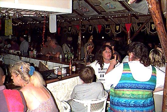 This perspective picture was taken at the first gathering of the Meeting of the Board (people who met on the online community known as The Negril Message Board - found off the Beingee's Main Menu), held on February 4th, 1999 at the Negril Yacht Club tries to capture a moment in time during the festivities. The flash on the Kodak digital was enough to even capture our guest Cyber Host Laura talking with Rasta John at the far left hand corner of the bar (where the NEN usually sets up at the Yacht Club). It was a crowded evening as you can tell from jst half the bar - and the whole place was packed! Be sure to click through the series of pictures (by clicking Next or Previous above or below) and see some more scenes from the "Meeting of the Board"! Irie!