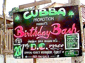 To find out the latest information about "whata g'won" in Negril, the standard method is the colorful signs proclaiming their parties! Today's picture shows us one such sign - for Cubba's Birthday Bashment at Jurassic Park on August 20th. When not in Negril, the place to find out what is happening is the Beingee's Shows & Events listing! We update our listing stringht from the source - these painted road signs! Irie! Daily Music News: the Negril Entertainment Network had a great a live sunset from the Mariner's Inn Sunset Show on Tuesday, and are looking forward to another wikked day on Wednesday starting with Irie Vibe's at 10:30am (til 1:30pm) and Roots Bamboo starting at 9:30pm! For the most current information about the NEN live webcast and chat in the Negril Chat Room keep checking the Negril Message Board!