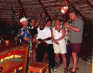 The Thirsty Thursday Internet Pub Crawl was resurrected on the Thurday the 22nd as Mark (left - with bagpipes) and Dave (right - with horn) marched through the streets of Negril's West End. It was an unforgettable night - this picture was taken at Prento's Thatch Hut Bar. The evening ended at DeBuss - one of the most memorable nights in Negril! Daily Music News: The Thursday NEN broadcast from DeBuss was cancelled (we couldn't find John, the owner to get phoneline connected) but the Friday schedule looks grreat with an afternoon/sunset broadcast from Irie Vibes Restaurant and Bar on the beach, and then an evening broadcast from the one and only Alfred's Ocean Palace! Yah mon! Keep on checking the Shows & Events listing and the Negril Message Board for details!